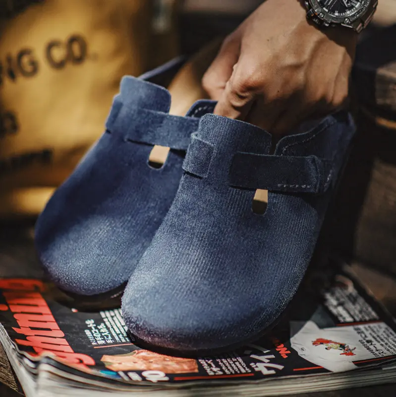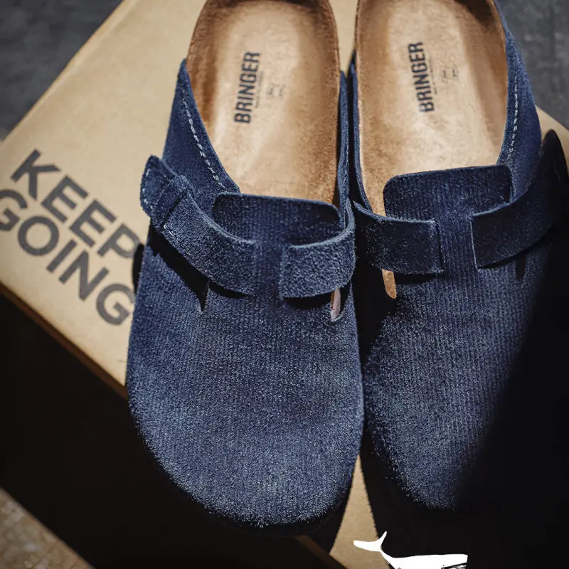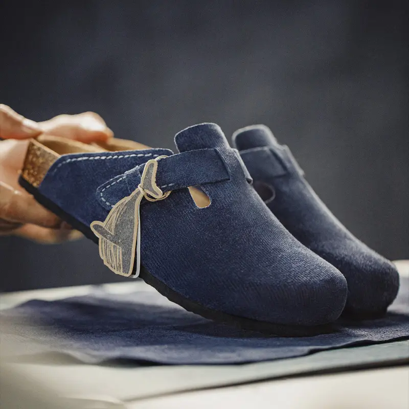 Men’s Retro Cork – Bed Clogs. Featuring a unique humpback whale – inspired design, they have a cork footbed with pressure – relieving technology to disperse foot pressure. The navy blue, textured fabric shows multi – layered colors in different lights. Perfect for casual summer outings, these round toe clogs are a trendy and comfortable choice.
