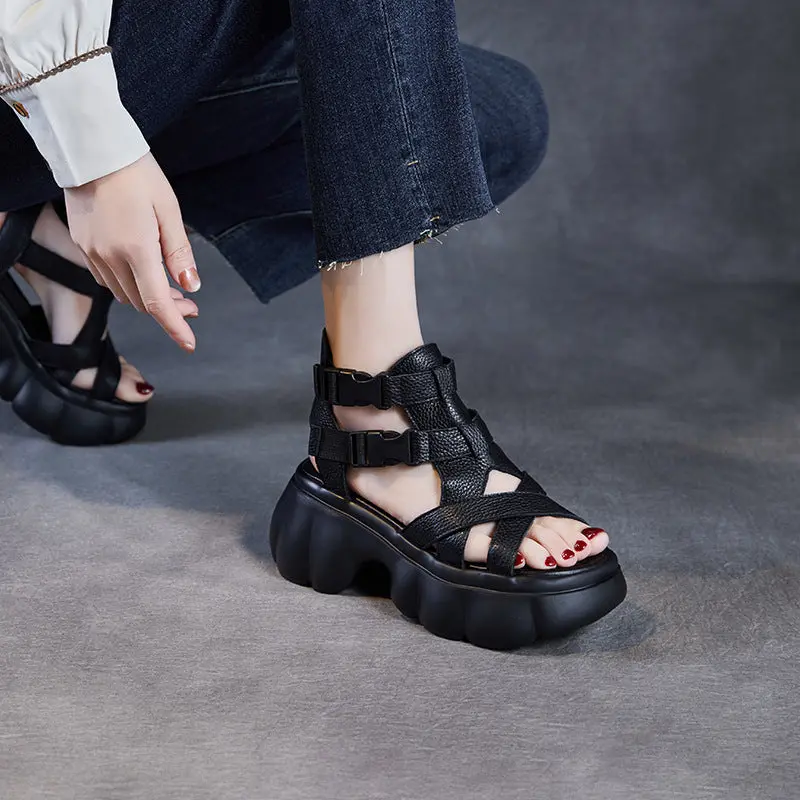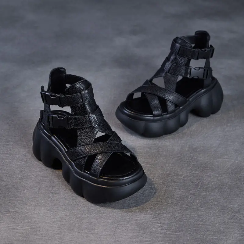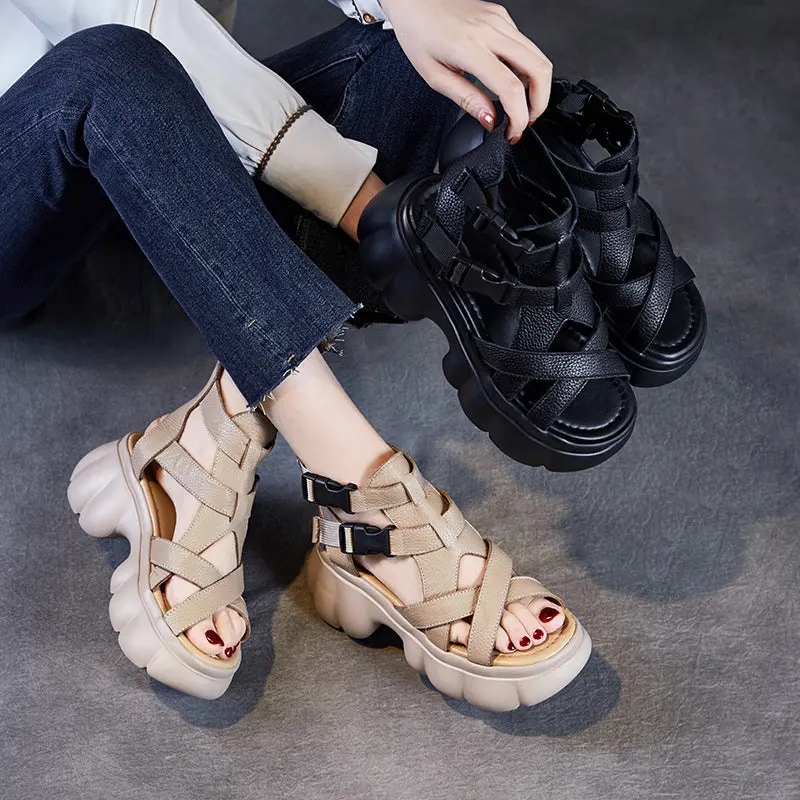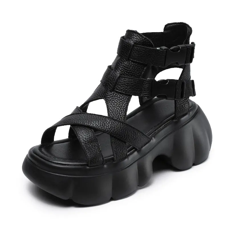 Women Retro Round Head Leather Platform Casual Sandals