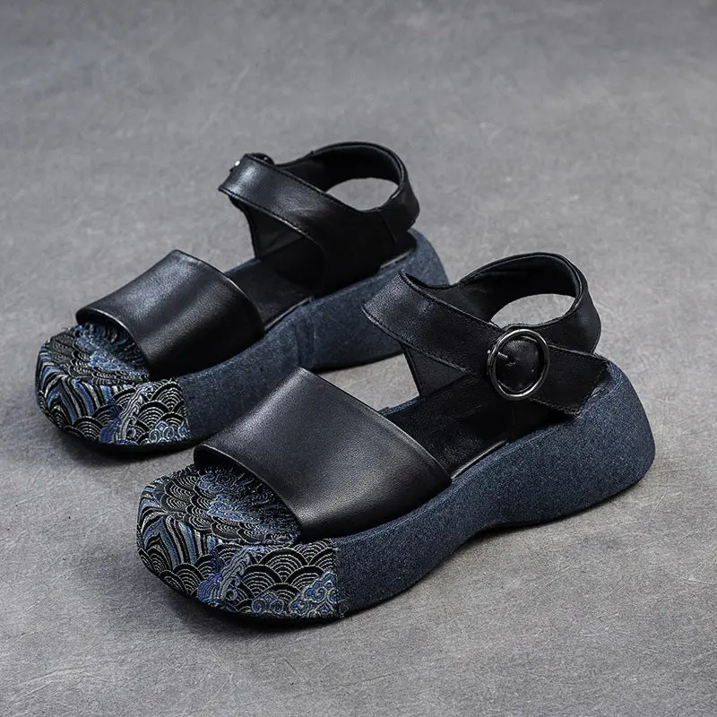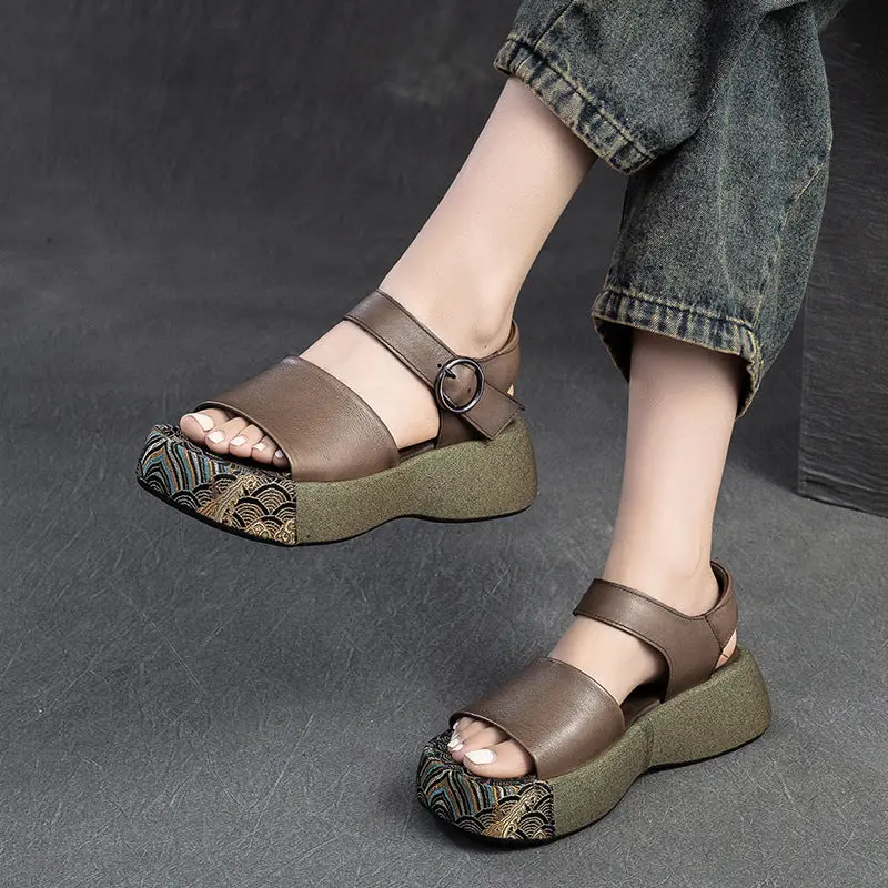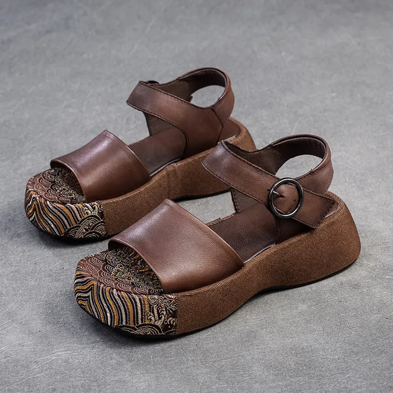 Women Retro Pattern Leather Thick Soled Casual Sandals