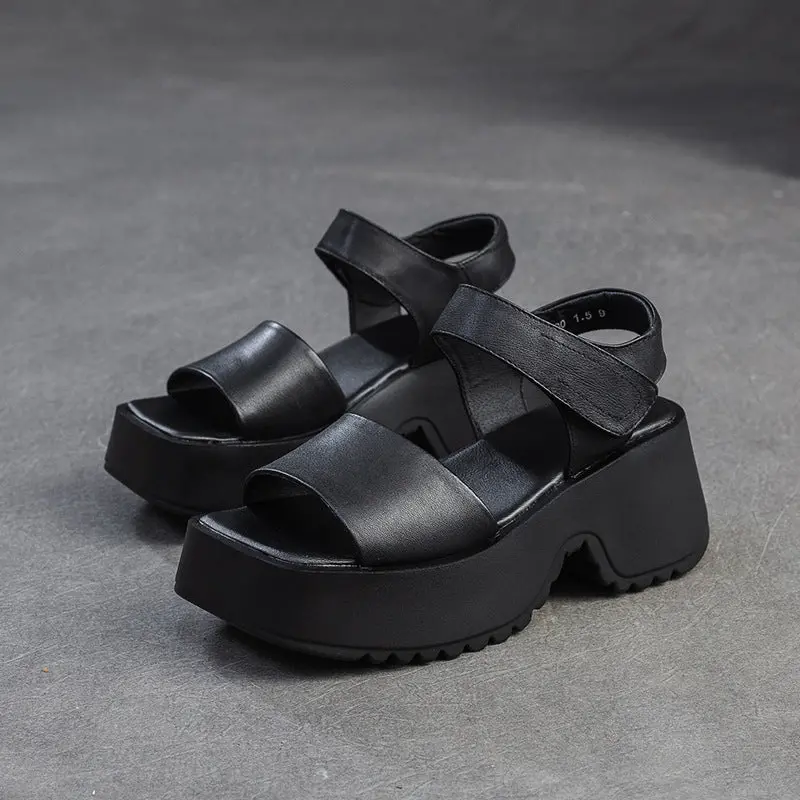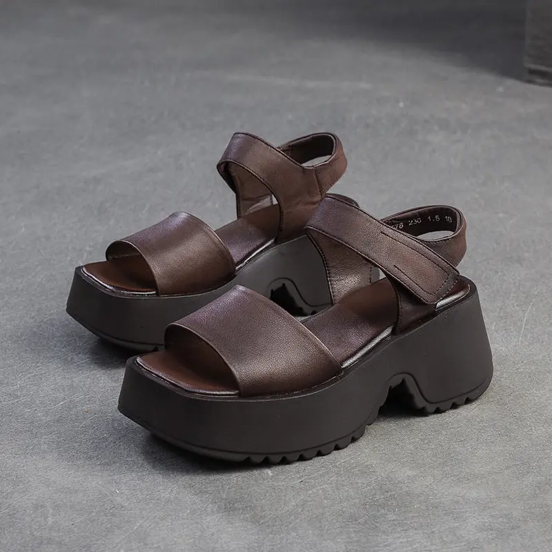 Women Retro Plain Leather Chunky Platform Sandals