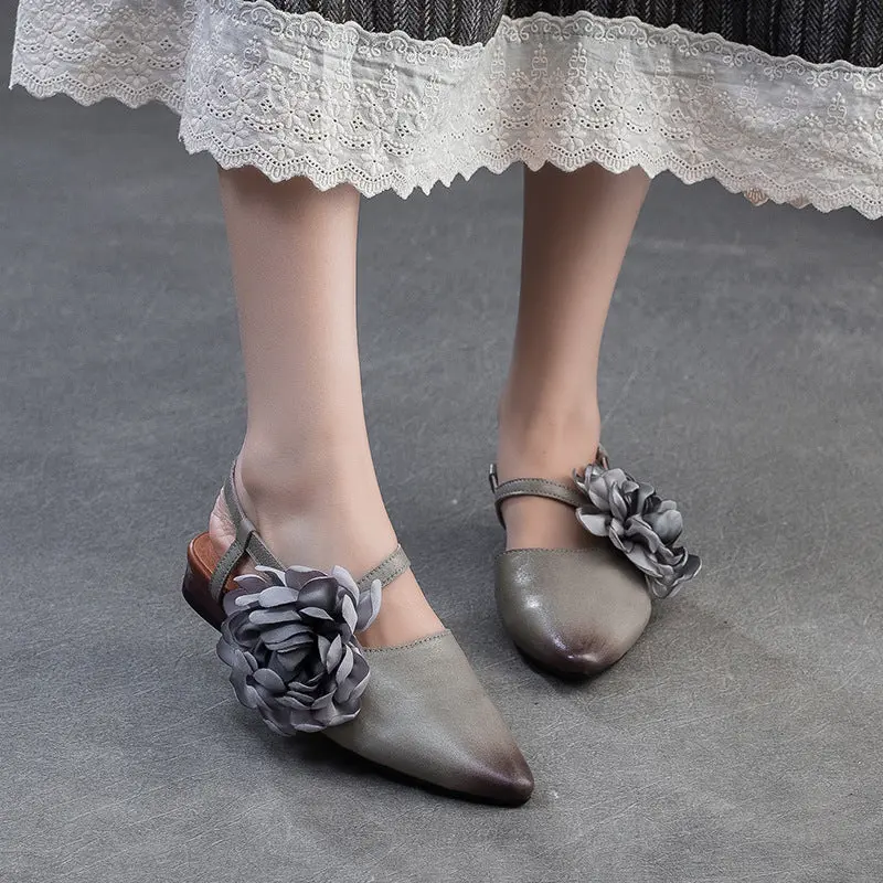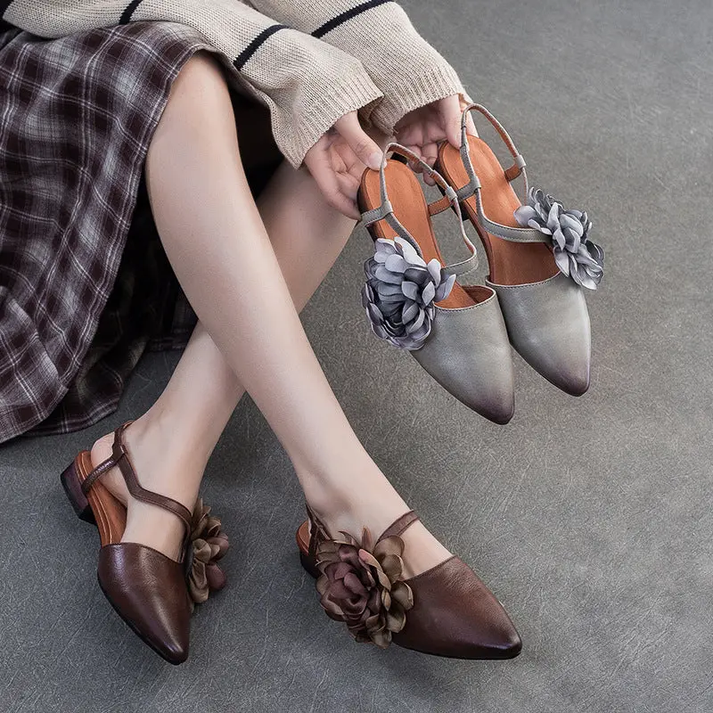 Women Retro Plain Leather Flower Pointed Toe Casual Sandals