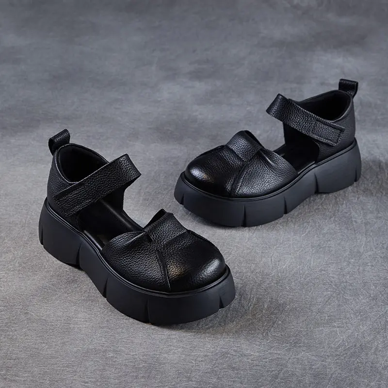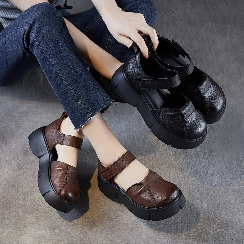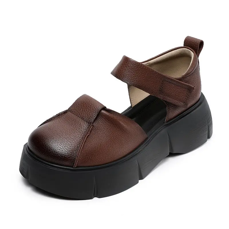 Women Retro Round Head Leather Platform Casual Sandals