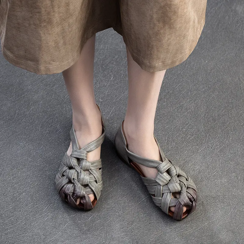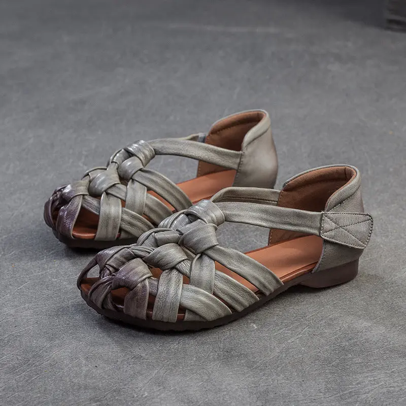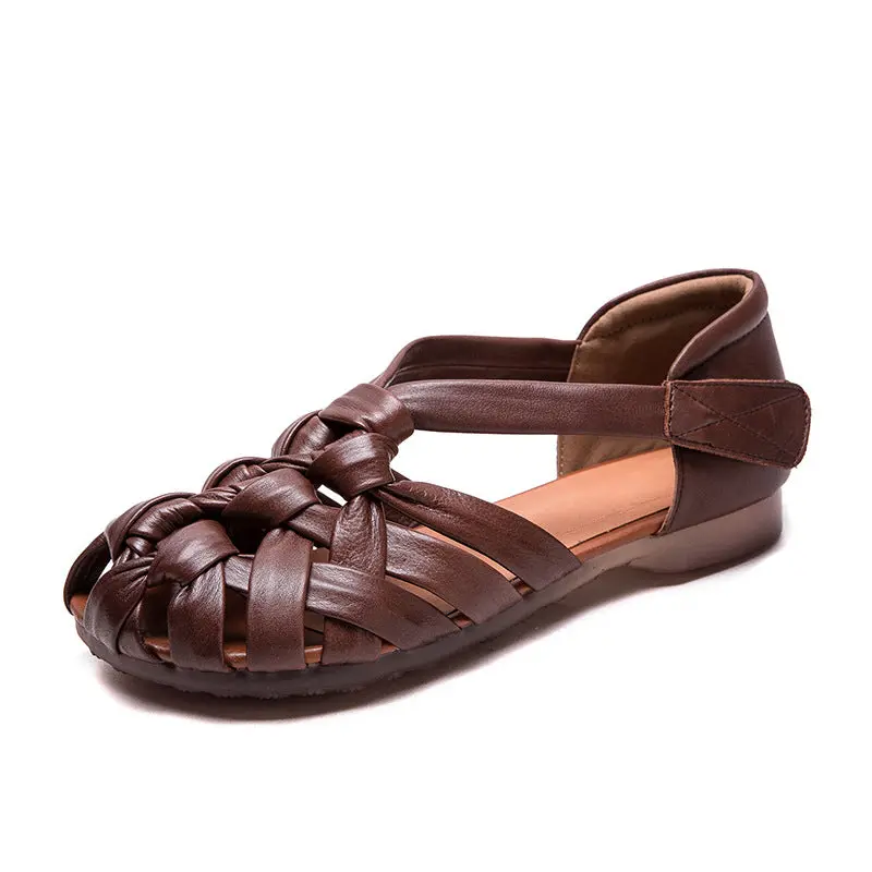 Women Vintage Plaited Leather Velcro Flat Sandals
