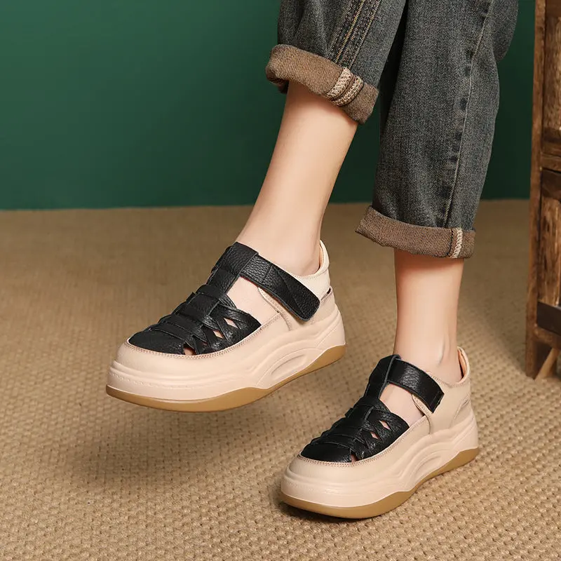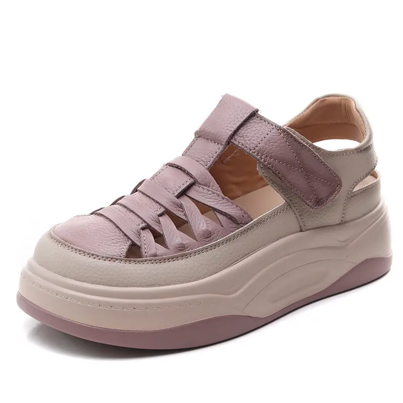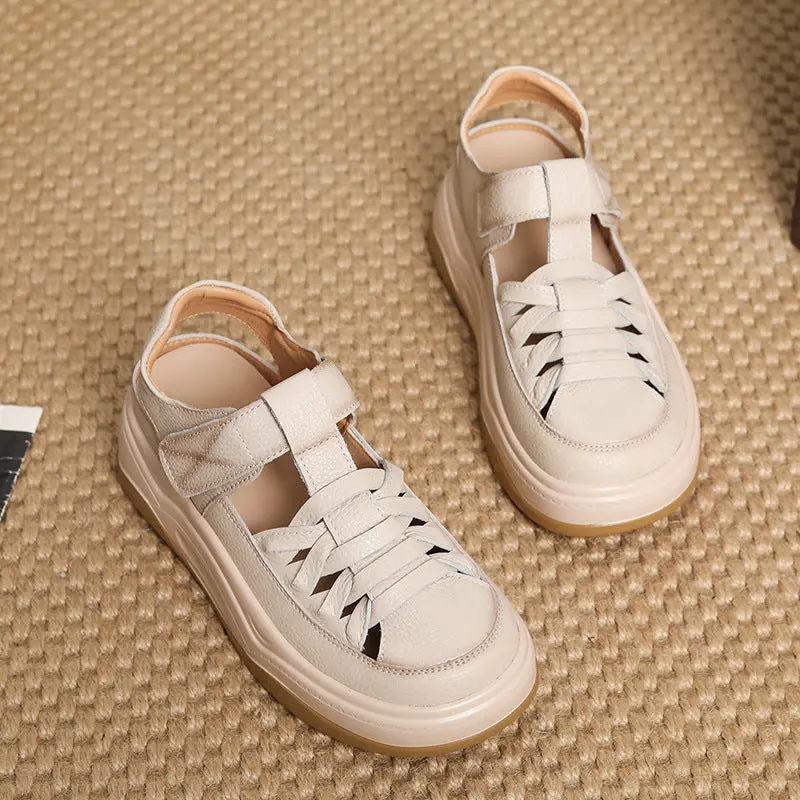 Women's Casual Plaited Leather Round Head Velcro Sandals