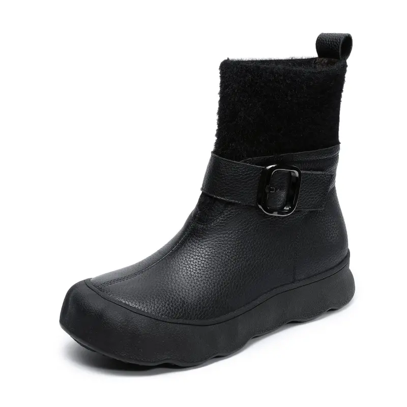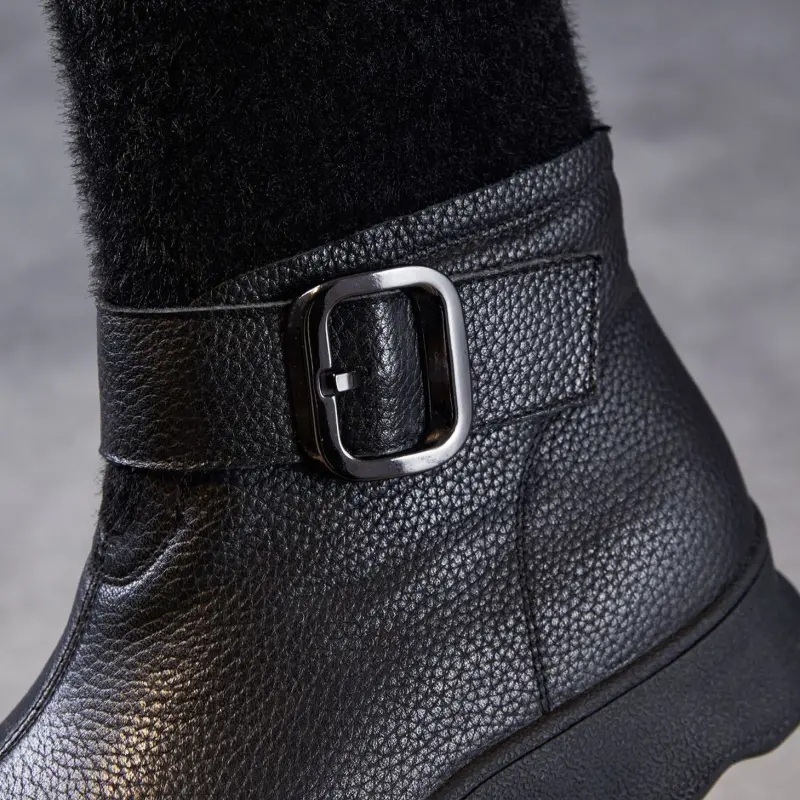 Women's Leather Buckle-Strap Furred Ankle Boots