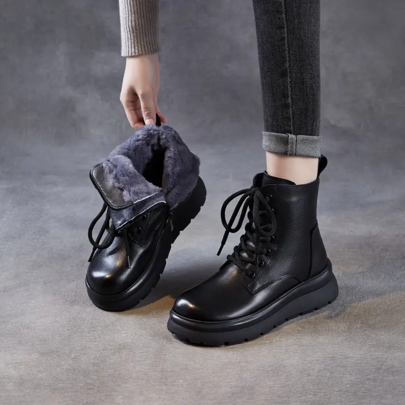Women's Plain Leather Furred Ankle Snow Boots