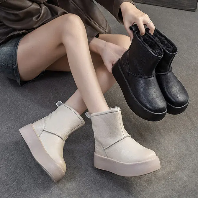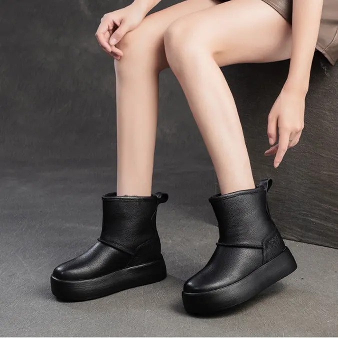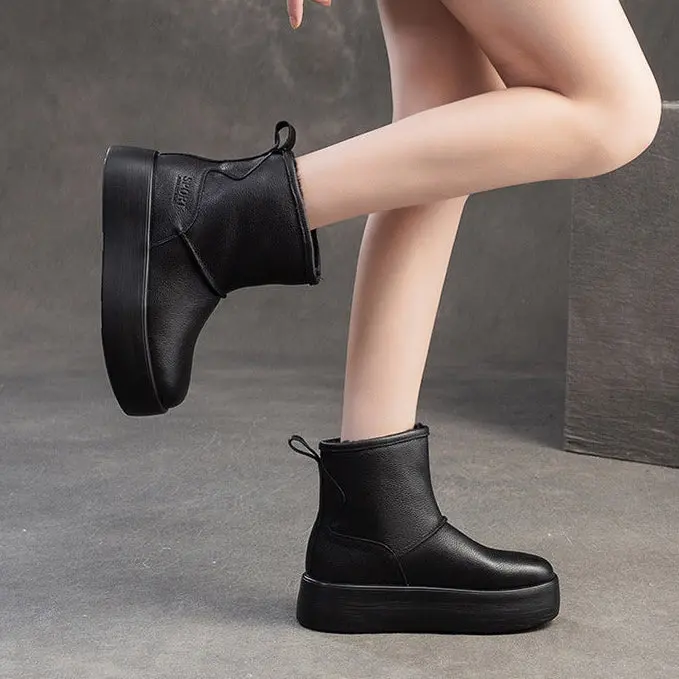 Women's Plain Quilted Leather Fleece Snow Boots