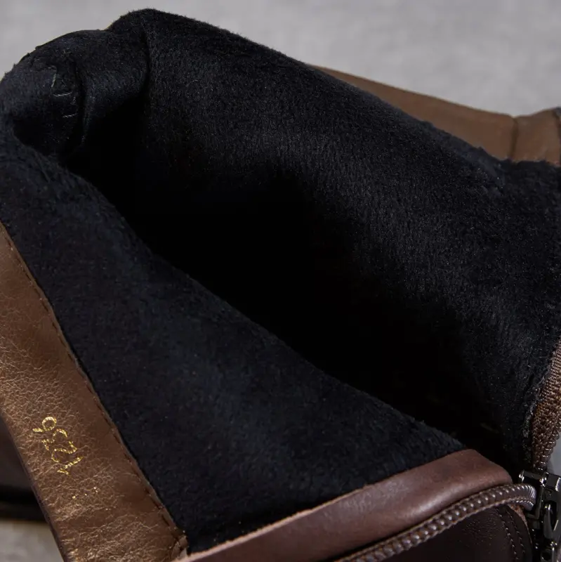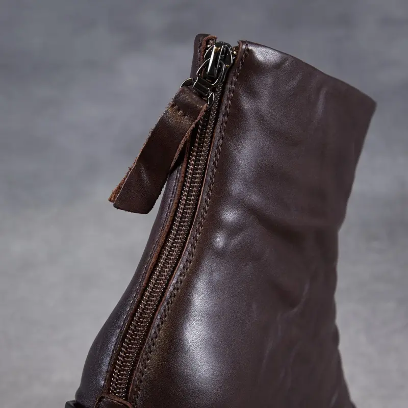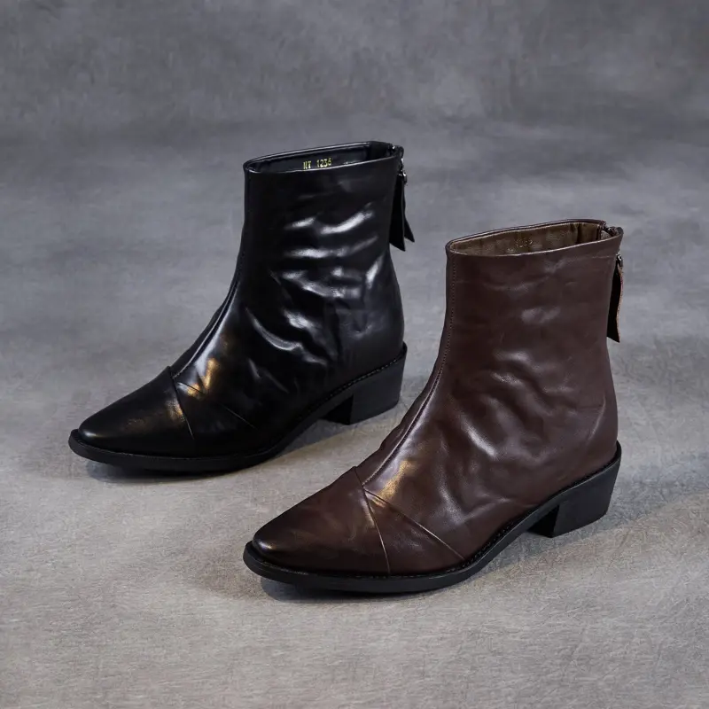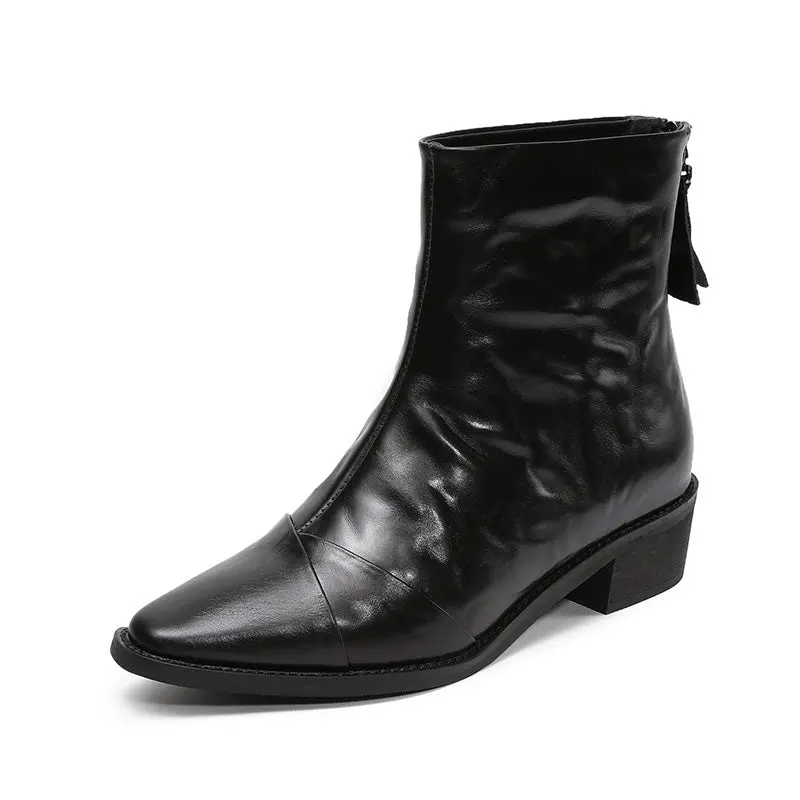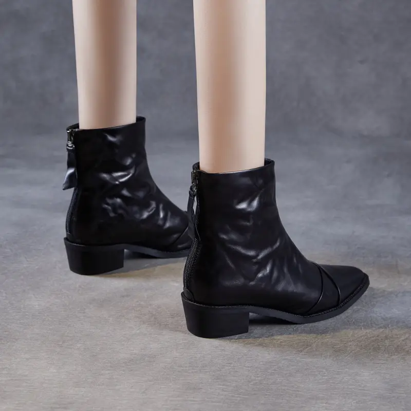 Women's Pleated Leather Low Block Furred Ankle Boots