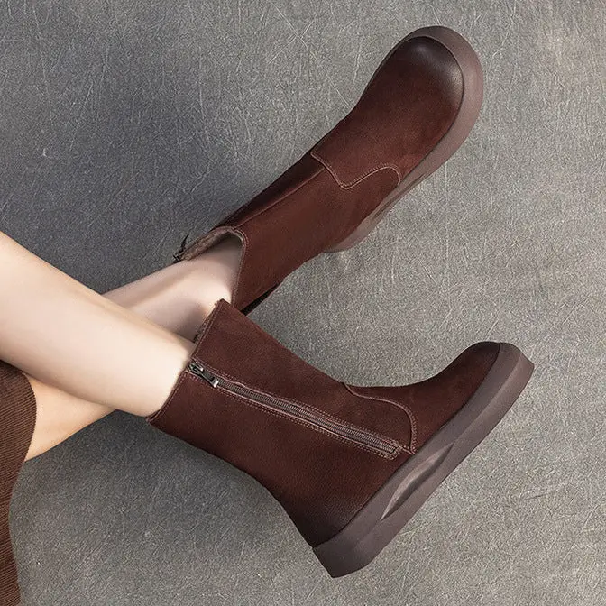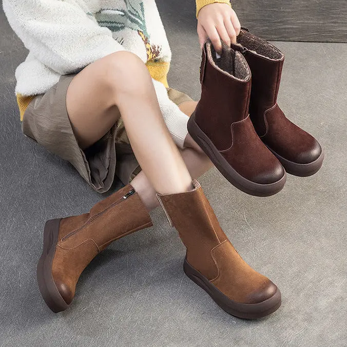 Women's Retro Leather Fleece Mid-Calf Boots