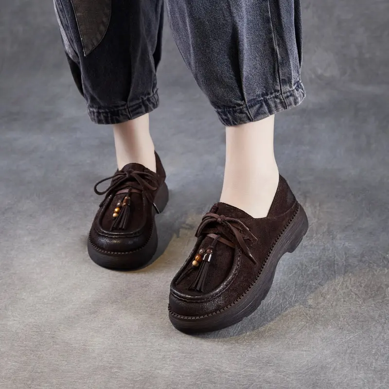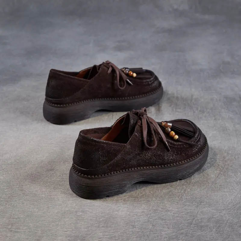 Women’s Retro Leather Fringe Casual Shoes. Crafted from top – grain leather (reverse – treated), they feature tassel + beaded accents, a 4cm rubber platform, and top – grain pigskin insoles for comfort, ideal for year – round casual styling.