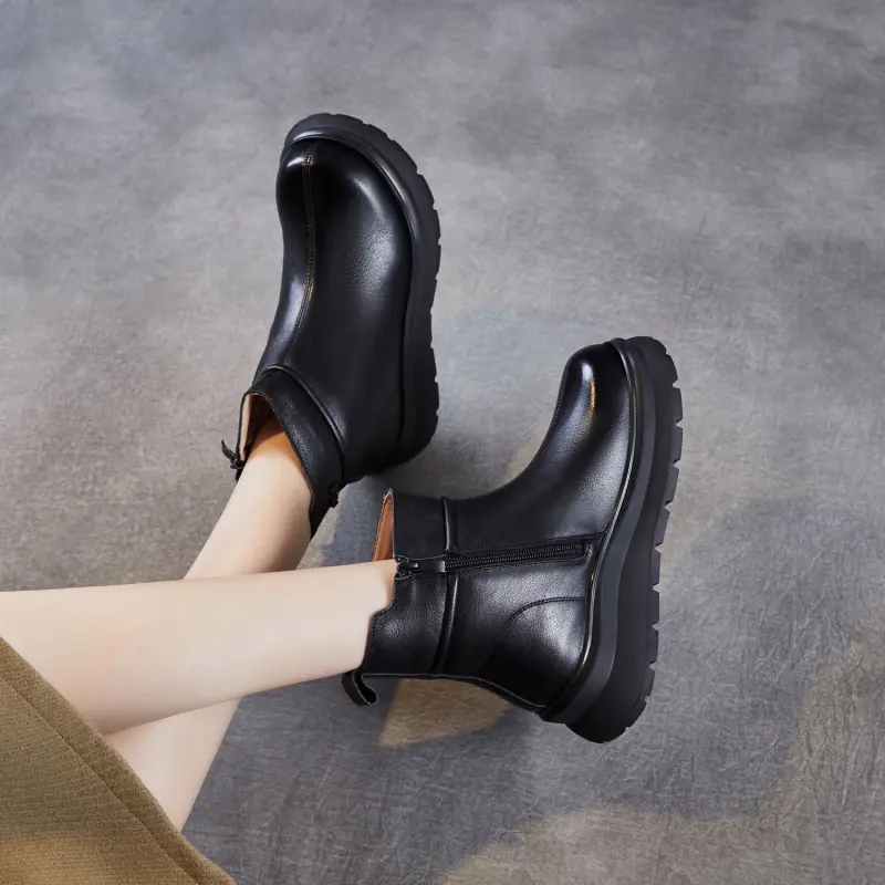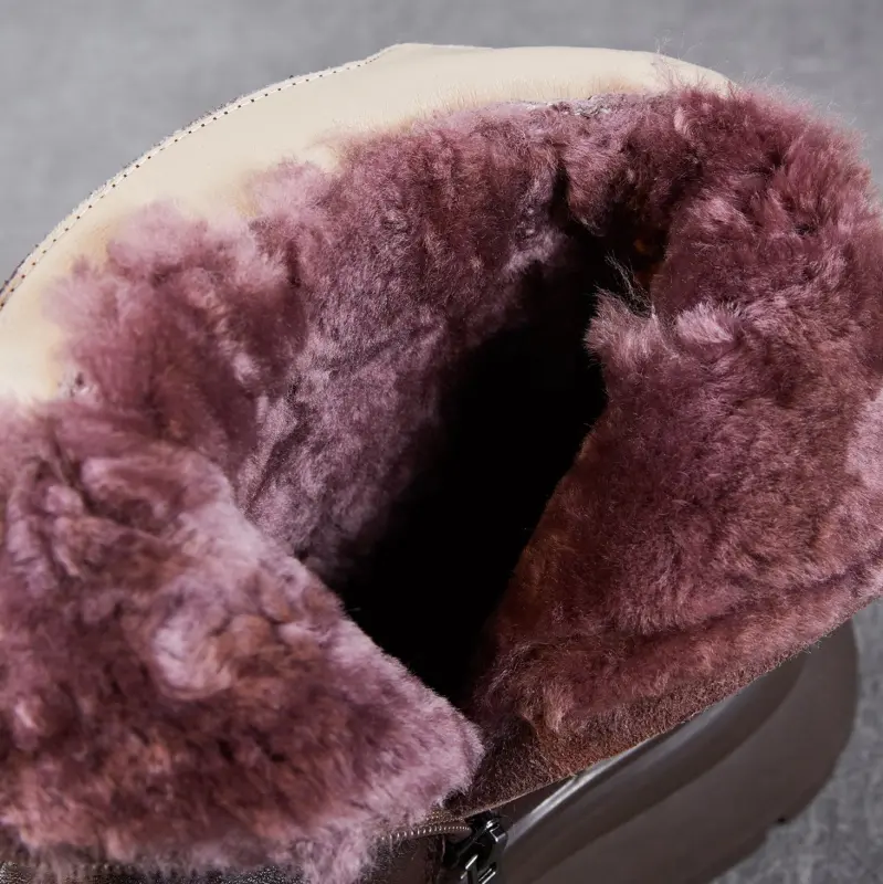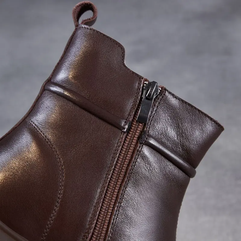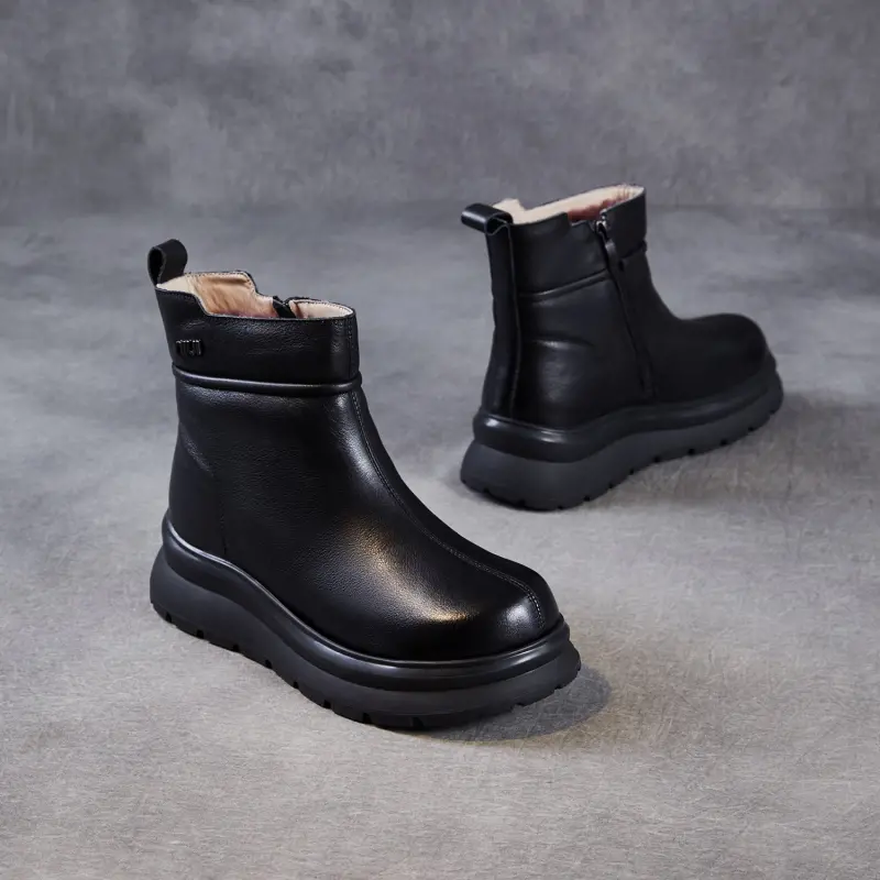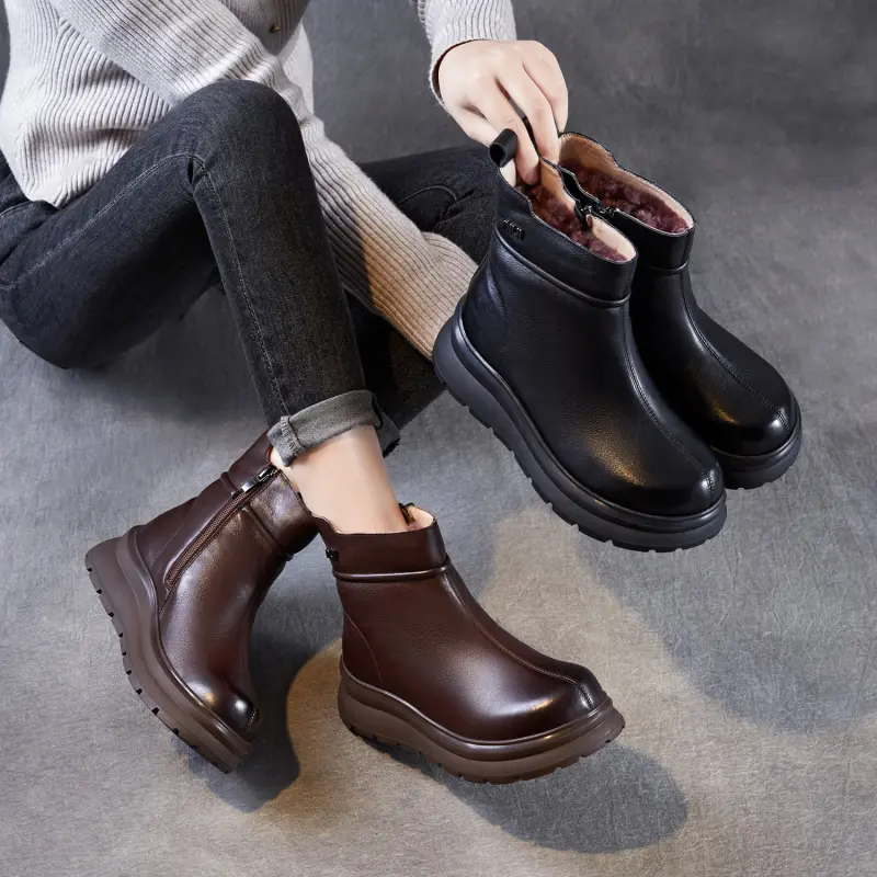 Women's Retro Plain Leather Woolen Ankle Snow Boots