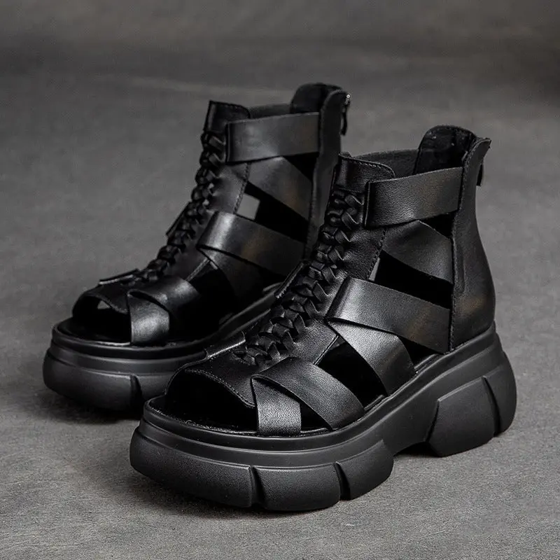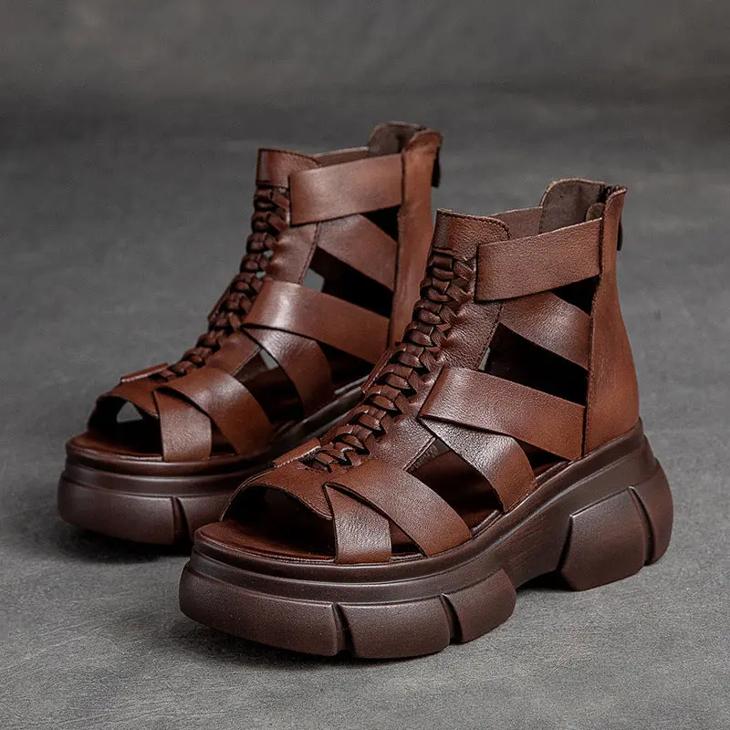 Women Retro Plain Leather Platform Velcro Tape Sandals