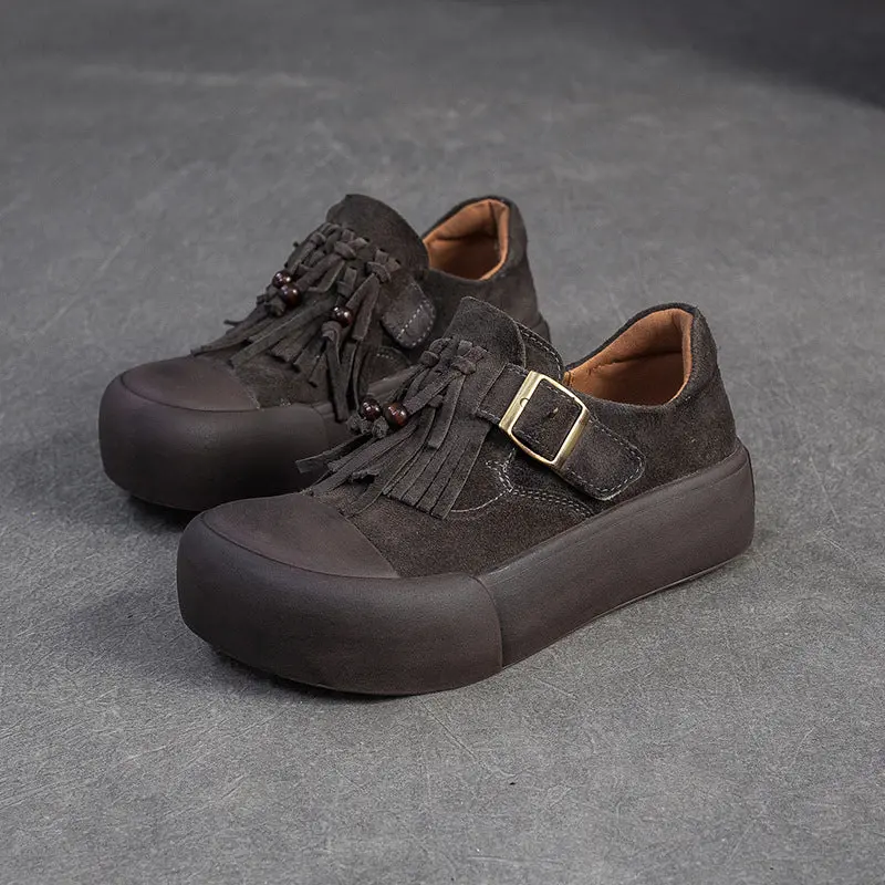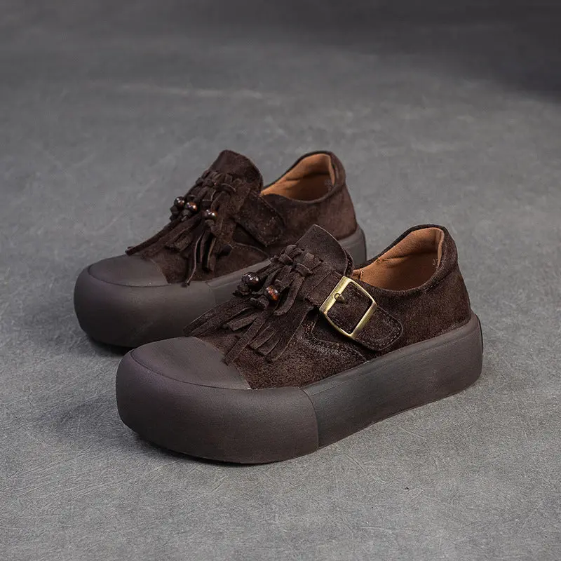 Women’s Vintage Fringed Platform Slip-on Shoes. Crafted from nubuck leather, they feature a velcro tape design with buckle detailing and fringes, a 4cm rubber platform sole, and pigskin insoles for comfort. The mori-girl style makes them ideal for year-round daily wear.