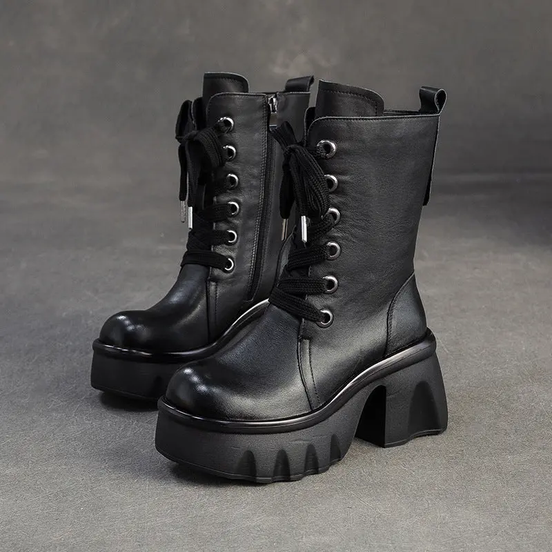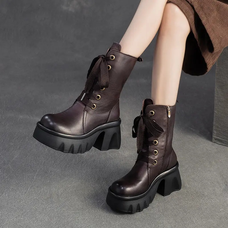 Women's Vintage Leather Chunky Platform Mid-Calf Boots