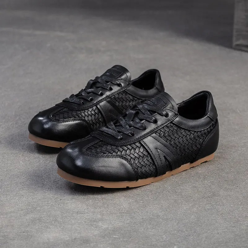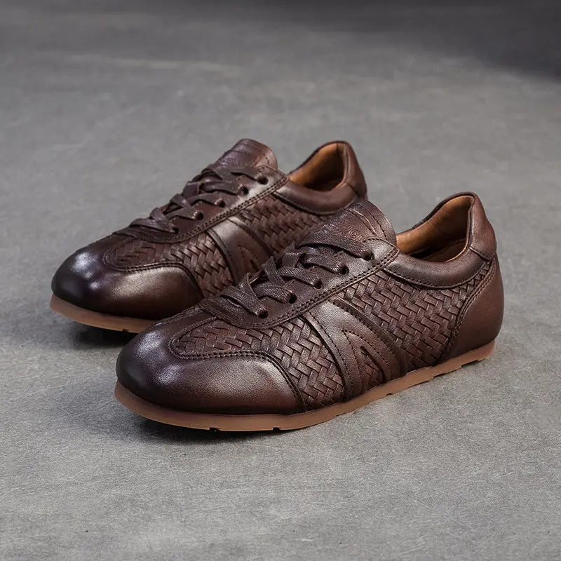 Women’s Vintage Leather Woven Casual Shoes. Crafted from cowhide leather with woven detailing, they feature a lace-up design, a 1cm cowhide sole platform, and pigskin insoles for comfort. The minimalist, retro style makes them ideal for year-round daily wear.