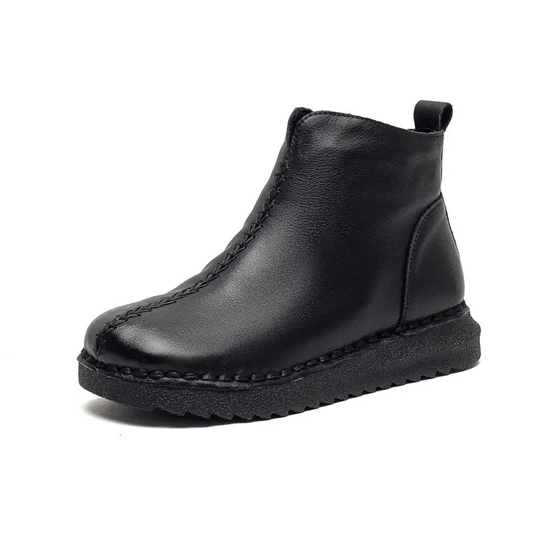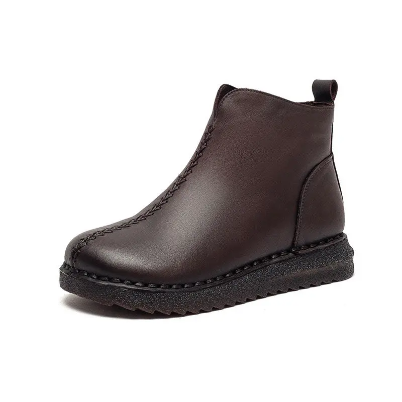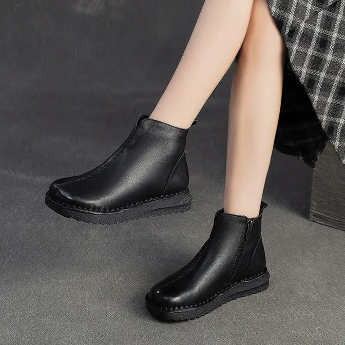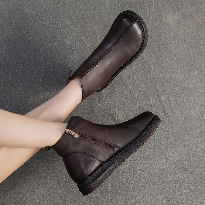 Women's Vintage Plain Leather Furred Flat Ankle Boots