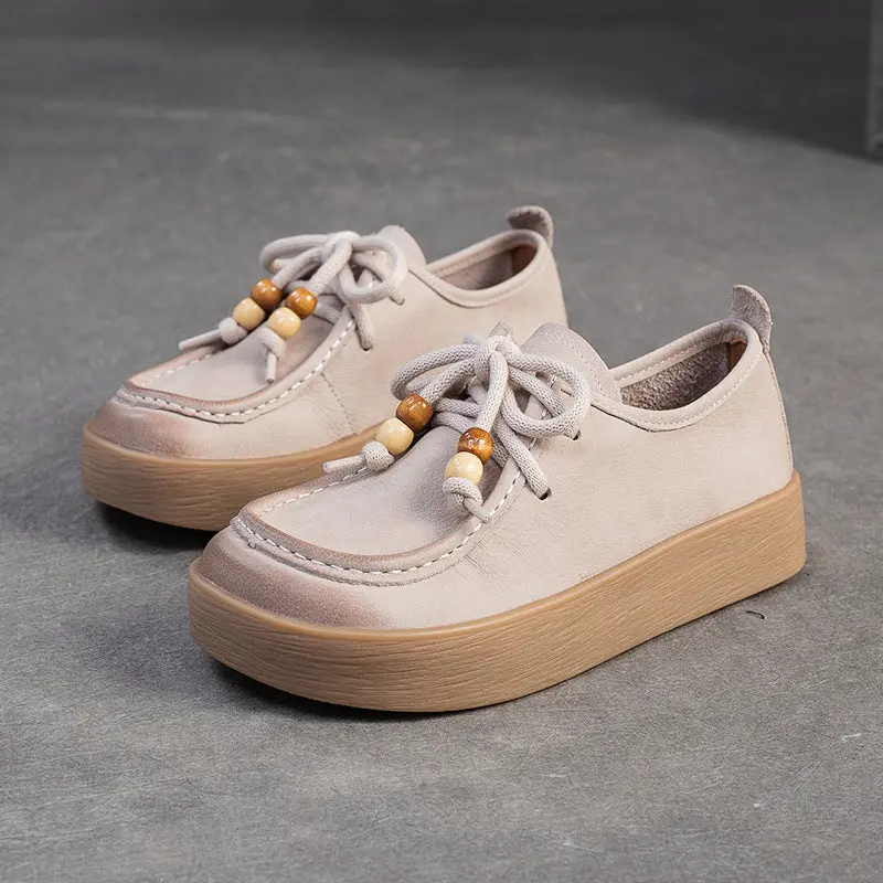 Women’s Vintage Suede Flat Casual Shoes crafted from nubuck leather with beaded lace detailing, they feature a lace-up design, a 3.5cm PVC platform sole, and pigskin insoles for comfort.